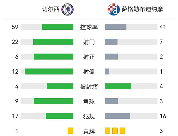 全场比赛结束,最终切尔西2-1逆转萨格勒布迪纳摩。