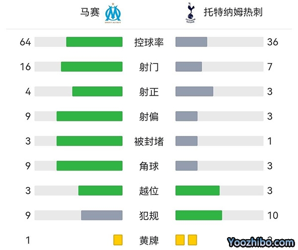 上半场补时阶段,第46分钟,马赛的战术角球开出,韦勒图右路传中,无人盯防的姆本巴高高跃起头球破门,马赛1-0热刺!