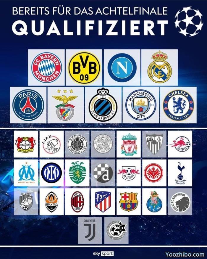 切尔西、巴黎圣日耳曼、多特蒙德和本菲卡本轮提前出线,加之之前的皇马、曼城、拜仁、那不勒斯和布鲁日,一共9支球队确定杀入16强。