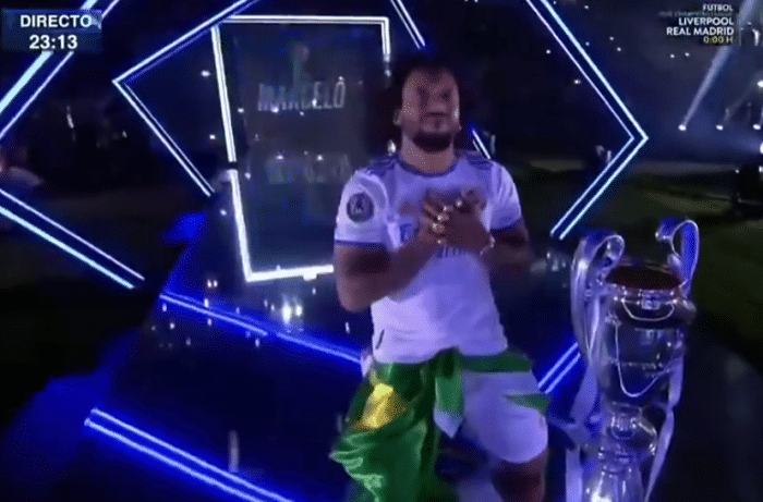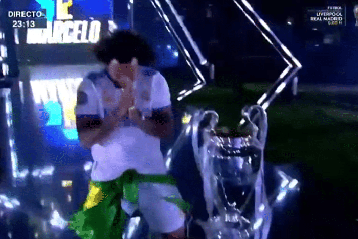 马塞洛将在今夏合同到期后离开皇马,他带着大耳朵杯走上球场后手摸队徽,流着泪跪在地上向球迷们和俱乐部道别。
