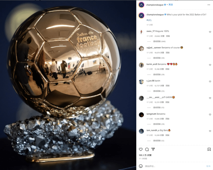 JRS直播网05月19日讯 欧冠官方Instagram账号今天发文询问球迷谁该获得今年的金球奖,马奎尔获得了最高赞。