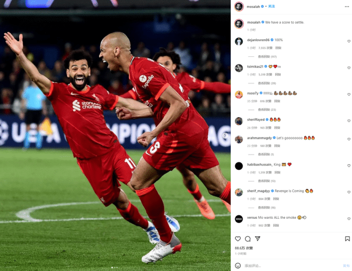 JRS直播网05月05日讯 今天凌晨,皇马3-1击败曼城,总比分6-5逆转进入欧冠决赛,赛后萨拉赫在Instagram上发文表示要复仇。