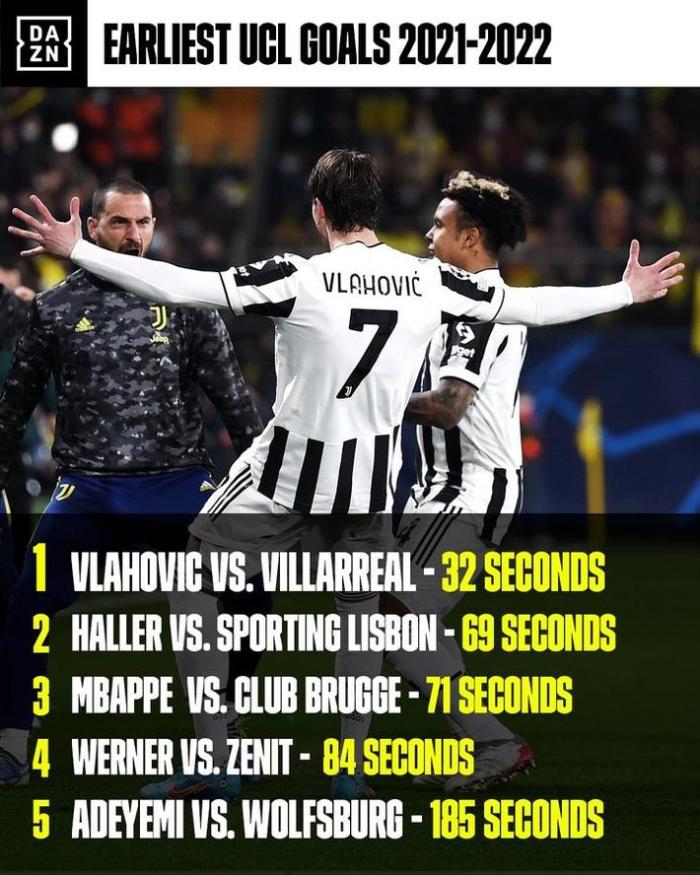 JRS直播网02月23日讯 据DAZN数据统计,弗拉霍维奇对比利亚雷亚尔的进球是本赛季欧冠最快的进球。