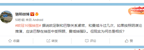 金球奖评委之一的骆明:据说欧足联和巴黎关系紧密,和曼城斗过几次,如果按照阴谋论推演,应该巴黎在抽签中受照顾,曼城抽强队。但现实为何总是相反?