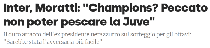 莫拉蒂说:“欧冠已经进入到淘汰赛阶段,可以说已经没有容易的对手了。也许在一些人的传统观念里,非四大联赛的球队会相对较弱,比如阿贾克斯、里尔、葡萄牙体育这些。”