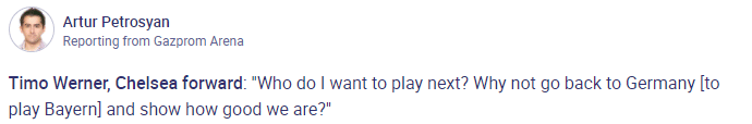 JRS直播网12月09日讯 今天凌晨,切尔西在欧冠小组赛末轮3-3平泽尼特,以小组第二身份晋级16强,赛后被问到希望接下来抽到谁时,维尔纳表示可以抽拜仁。