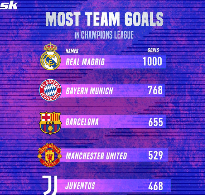 JRS直播网11月04日讯 皇马进球了,他们在欧冠小组赛第三轮比赛中2比1战胜了矿工,而本场比赛对皇马来说意义非凡,因为他们创下了一个纪录,他们是欧冠所有球队中,第一支进球数达到1000的球队。本场比赛中,本泽马梅开二度,他帮助球队打进了球队欧冠历史上的第1000球和1001球,而皇马也成为欧冠历史上第一支千球俱乐部,那么其他豪门在欧冠赛场上的进球数如何呢?
