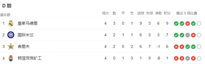 D组皇马9分领跑,国米7分紧随其后,谢里夫6分第三,矿工1分垫底。