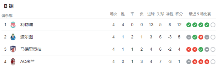 B组利物浦4战全胜12分领跑,已确定出线,波尔图5分第二,马竞4分第三,米兰1分垫底。