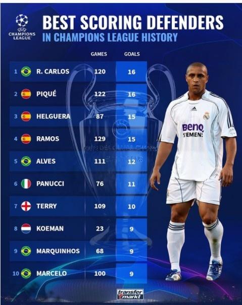 JRS直播网讯 足坛有很多带刀后卫,他们在比赛中能够打进很多球,而在欧冠赛场上当然少不了带刀后卫,那么在欧冠历史上,哪些后卫的进球最多呢?近日,德国权威媒体《转会市场网》盘点了欧冠历史上后卫进球排行榜,其中巴西后卫罗伯特卡洛斯和西班牙后卫皮克位居榜首,两人在欧冠赛场上的进球都达到了16球,而足坛著名的带到后卫拉莫斯只排名第四。话不多说,一起看内容。
