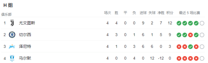 H组方面尤文展现出在国内赛事中所消失不见的强势,4轮全胜12分排第一,切尔西9分第二,泽尼特3分第三,马尔默0分垫底。