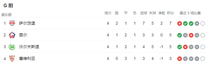 关注度最少的G组由萨尔茨堡红牛领跑,他们4战积到7分排第一,法甲冠军里尔5分第二,沃尔夫斯堡同积5分第三,塞维利亚表现糟糕,4轮3平1负3分垫底。