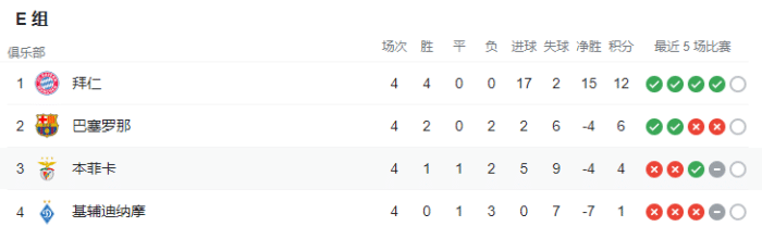 E组方面,拜仁4战4胜狂轰17球,以绝对的碾压姿态拿到12分,排名第一。巴萨方面4轮6分排名第二,本菲卡4分第三,基辅迪纳摩1分垫底。