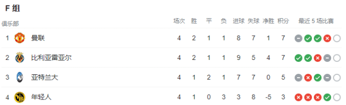 F组曼联客平亚特兰大后仍然7分领跑积分榜,比利亚雷亚尔7分因胜负关系紧随其后,亚特兰大5分第三,伯尔尼年轻人3分垫底。