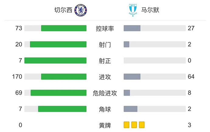下半场伤停补时2分钟,第90+2分钟,哈弗茨半单刀机会被迪亚瓦拉出击破坏。全场比赛结束,最终切尔西4-0击败马尔默。