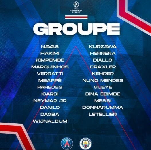 JRS直播网9月28日讯 明天凌晨3点,欧冠联赛,巴黎主场对阵曼城,赛前巴黎公布了对阵曼城的大名单,其中梅西、维拉蒂回归。