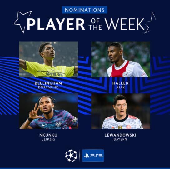 JRS直播网9月16日讯 本周的欧冠赛事已经全部结束,欧足联今天公布了周最佳球员的候选名单,贝林厄姆、莱万多夫斯基、阿莱和恩昆库均入选。