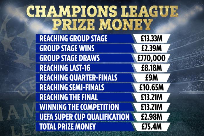 进入淘汰赛的16强球队,将获得818万英镑奖金;打进8强的话,则再有900万英镑奖金;若能进入半决赛,将获得1065万英镑奖励;跻身明年的最终决赛的两队,将至少获得1321万英镑奖金;最终夺冠的队伍,还有298万英镑的冠军奖励,那是下赛季欧洲超级杯的参赛奖金。