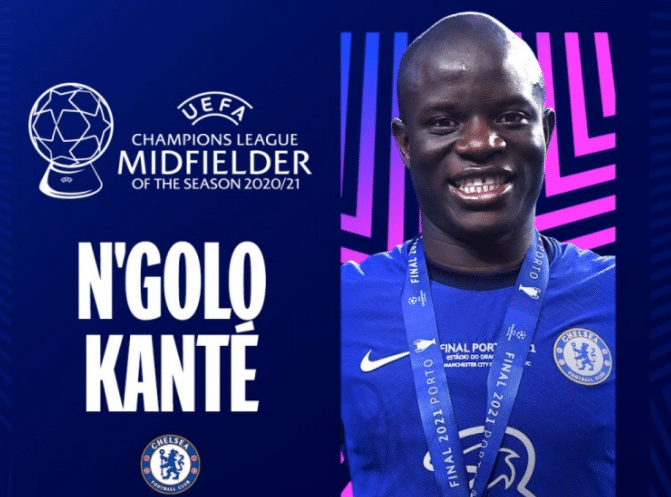坎特是上个赛季欧冠最佳中场,他带领切尔西拿下欧冠冠军,同时在和曼城的决赛中表现抢眼,拿下欧冠决赛最佳球员的荣誉,恭喜。