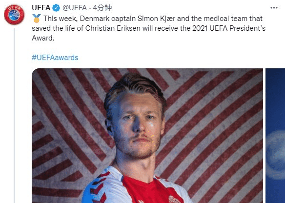 欧足联主席奖:克亚尔和丹麦医疗队;