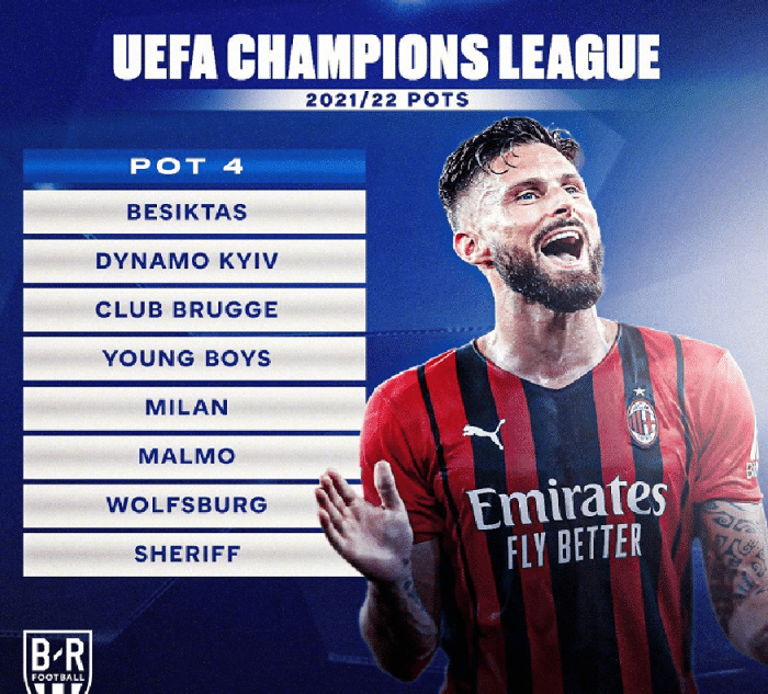 第四档的球队分别是贝西克塔斯、基辅迪纳摩、布鲁日,伯尔尼年轻人,米兰,马尔默,沃尔夫斯堡和谢里夫。这个档次的球队一共有7个欧冠冠军,当然都是米兰获得的。不过,除了米兰的冠军以外,布鲁日、马尔默也都拿到过欧冠亚军哦。