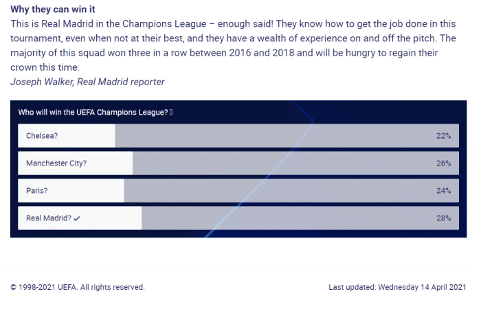 JRS直播网讯 欧冠四强出炉了,欧足联也开始为欧冠造势,那么谁能夺得本赛季欧冠冠军呢?近日,欧足联在官网上点评了欧冠四强的四支球队,最后还发布了一个投票,他们让球迷来预测谁能夺得本赛季欧冠冠军。而到目前为止,曼城的排名仅仅第二,而排名第一的是皇马,看来大家都相信皇马,都相信齐达内的玄学啊。话不多说,先看看欧足联是怎么点评各大球队的。
