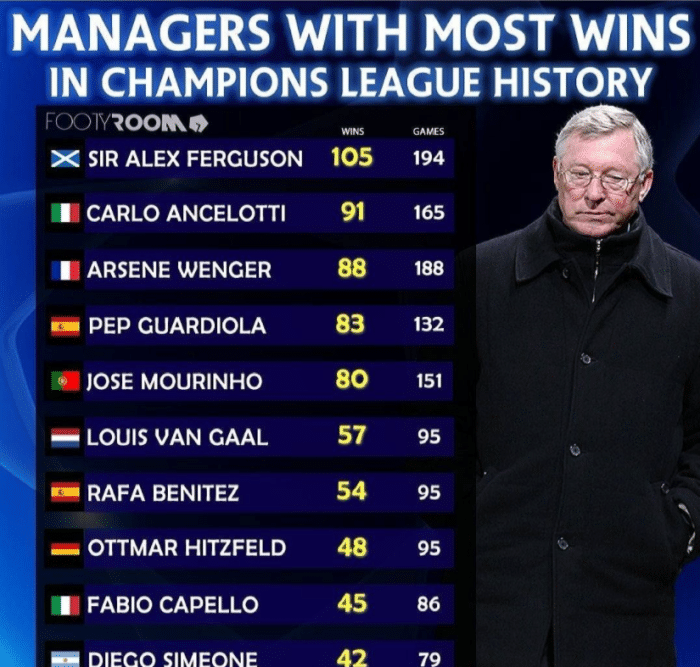 弗格森爵士一共带队踢了194场欧冠比赛,而他拿到了105场胜利,是欧冠赛场上获胜次数最多的主帅。随后是安切洛蒂,他带队踢了165场欧冠,拿下了其中91场。而第三的是温格,他带队踢了188场欧冠,赢下了88场。第四是瓜迪奥拉,他带队踢了132场欧冠,赢下了83场比赛,第五是穆里尼奥他带队踢了151场欧冠,赢下了80场比赛。随后是范加尔的57胜,贝尼特斯的54胜,希斯菲尔德的48胜,卡佩罗的45胜和西蒙尼的42胜。