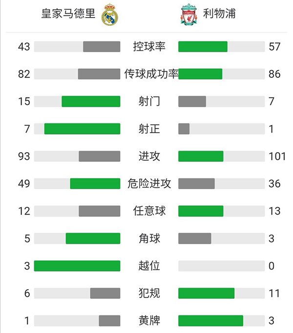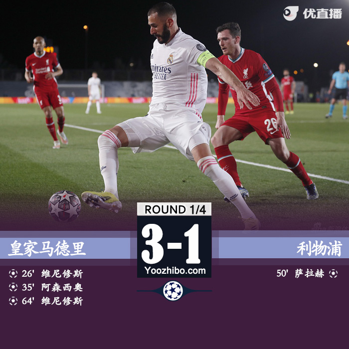 全场比赛结束,皇家马德里主场3-1战胜利物浦。
