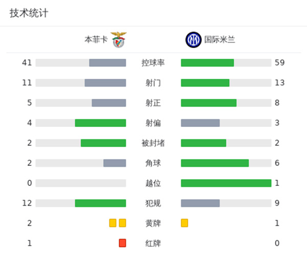 关键事件: 第5分钟,安东尼奥-席尔瓦右路长传给到禁区,滕斯泰特头球回做,若昂-马里奥跟上直接左脚推射破门!本菲卡1-0国际米兰↓