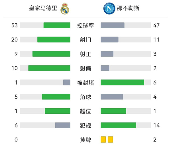最终全场比赛结束,皇马4-2那不勒斯。