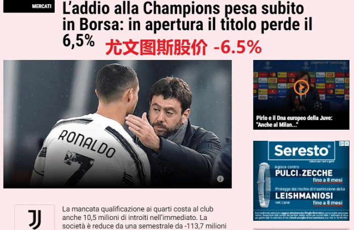 尤文战绩的波动是有连锁反应的,他们是一家上市俱乐部,所以股价也有明显的波动,根据《米兰体育报》的消息显示,尤文欧冠出局对俱乐部股价影响巨大,今天开市后,尤文的股价下跌6.5%,目前是0.8欧元一股。
