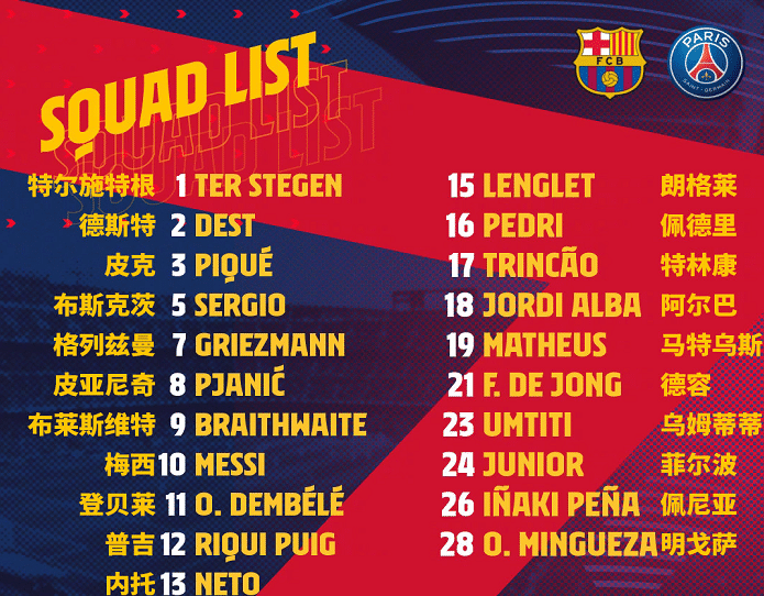 JRS直播网讯 2月16日晚上,西甲豪门巴萨公布了在北京时间2月17日凌晨4点进行的欧冠淘汰赛对阵大巴黎的比赛名单,通过名单可以看到梅西和特尔施特根领衔,已经为巴萨出战100场的登贝莱在列,皮克也终于回归。
