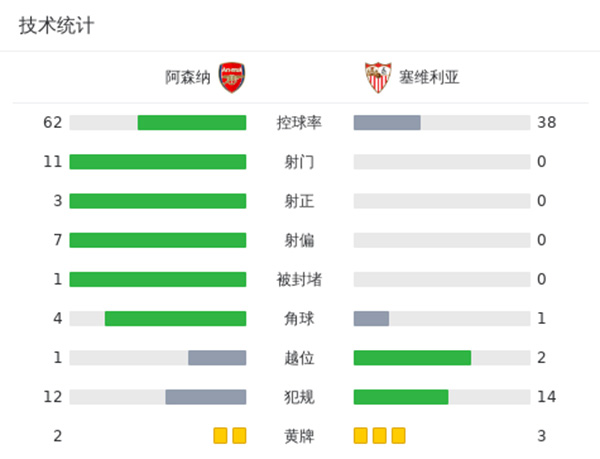全场比赛结束,最终阿森纳2-0塞维利亚。