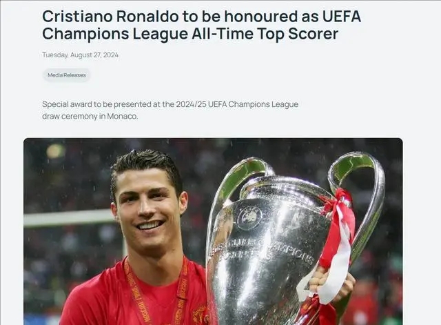 JRS直播网讯 2024-2025赛季欧冠将进行改制,进入新赛制。欧足联官方宣布,将于当地时间8月29日(北京时间8月30日0点)的欧冠抽签仪式上,向欧冠历史最佳射手C罗授予特殊奖项。