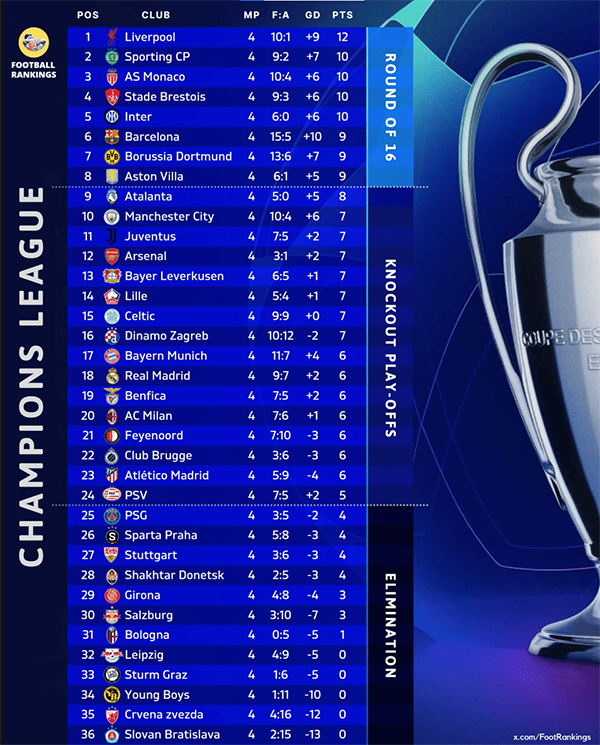 JRS直播网讯北京时间11月7日凌晨,欧冠联赛阶段第4轮全部比赛结束。本轮过后,英超豪门利物浦成唯一全胜队领跑积分榜。而在利物浦身后排名第2至第4位的,竟然不是传统的欧冠豪门球队,而是葡萄牙体育、摩纳哥和布雷斯特。