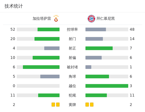 全场比赛结束,拜仁慕尼黑3-1加拉塔萨雷。