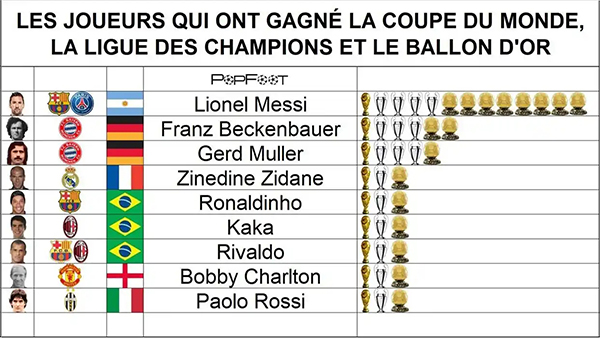 JRS直播网讯 国外数据博主晒图统计获得过世界杯+欧冠+金球奖的球员,具体如下: