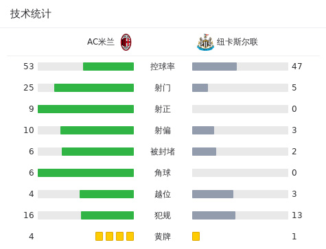 全场比赛结束,AC米兰0-0纽卡斯尔。