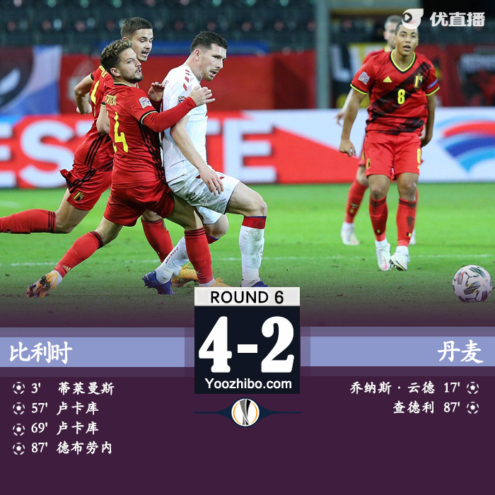 全场比赛结束,比利时主场4-2击败丹麦,6战5胜1负积15分锁定头名晋级。