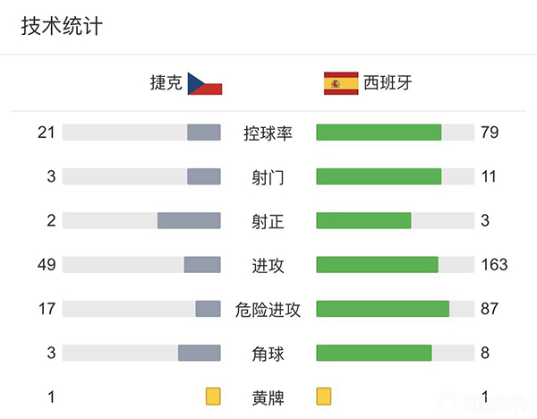第4分钟,捷克取得进球,泽莱尼接队友直塞后带球突进,在禁区内横传给佩塞克,后者推射破门,VAR确认进球有效,捷克1-0西班牙。