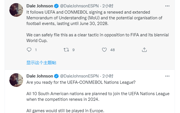 JRS直播网12月18日讯 2024年欧国联重启时,南美的10个国家都会加入,所有比赛都会在欧洲进行。欧足联和南美足联签订了一份到2028年6月30日的赛事举办备忘录,这是在对抗国际足联和他们两年一届的世界杯。