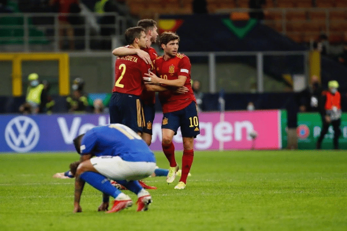 JRS直播网10月07日讯西班牙国家队在欧国联半决赛的比赛中,2比1战胜了意大利国家队,晋级第二届欧国联决赛,而他们在决赛的对手会是法国国家队和比利时国家队的胜者。这种情况下,许多人都开始猜测,谁能拿下本届欧国联的冠军呢?而不少西班牙媒体都看好自己的国家队,甚至有人认为,西班牙队已经提前锁定了本届欧国联冠军了,因为他们的主帅恩里克在决赛赛场上的战绩绝对彪悍,8次进入决赛7次夺冠,这样的战绩,给了西班牙媒体极大的信心。