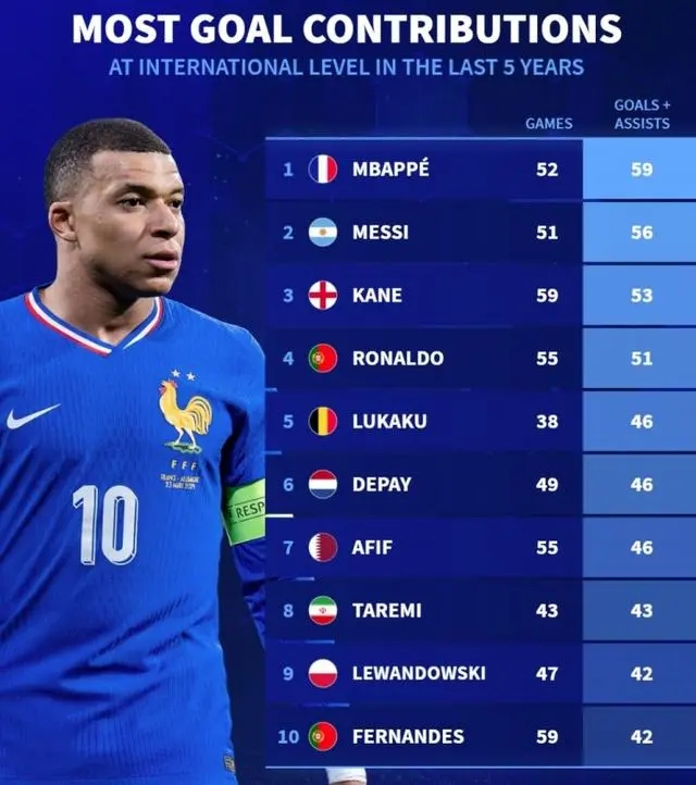 JRS直播网讯 《转会市场》统计了近5年国家队直接参与进球榜(进球+助攻):