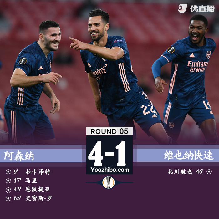 JRS直播网讯:北京时间12月4日04:00(英国当地时间3日20:00),2020/21赛季欧联B组第5比赛日一场焦点战在酋长球场展开争夺,阿森纳主场4比1大胜维也纳快速,拉卡泽特、马里、恩凯蒂亚和洛维先后进球,北川航也扳回一城。阿森纳5战全胜锁定小组头名。