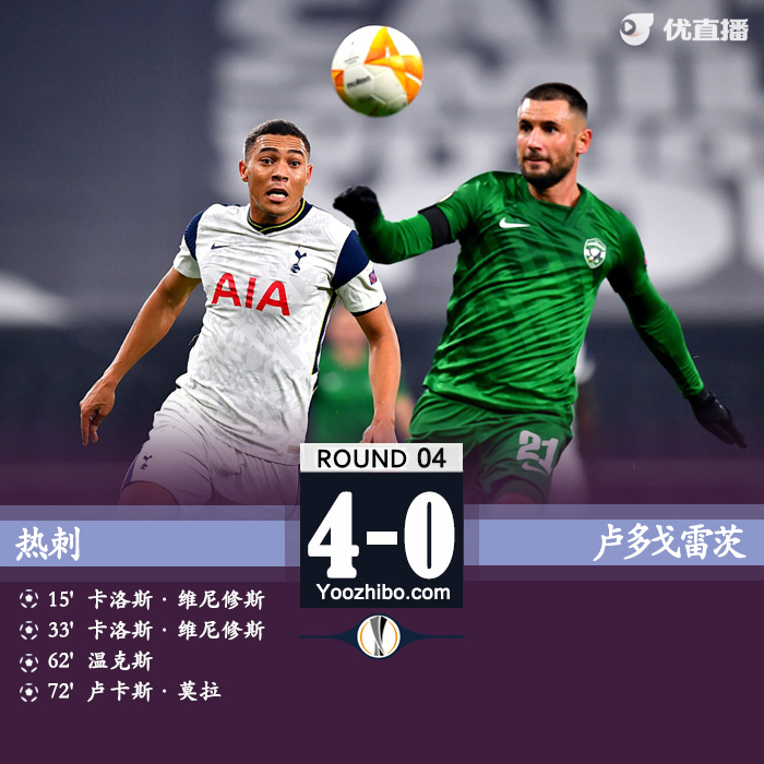 JRS直播网讯:北京时间11月27日4时(英国当地时间26日20时),欧联杯小组赛J组第4轮开始第2场较量,热刺主场4比0轻取卢多戈雷茨,积9分领跑。卡洛斯-威尼修斯首度为热刺破门,梅开二度且助攻小卢卡斯得分。温克斯超远吊射得手。本-戴维斯中柱。