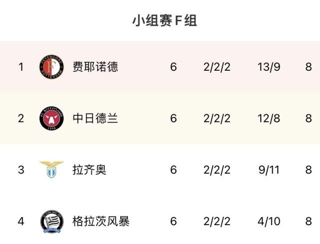 JRS直播网11月04日讯 凌晨,欧联杯F组结束了最后1轮的争夺。最终费耶诺德主场1-0战胜拉齐奥,中日德兰主场2-0战胜格拉茨风暴。这一比分结果,也知道导致该组末轮后,出现了4支球队同积8分的奇景。