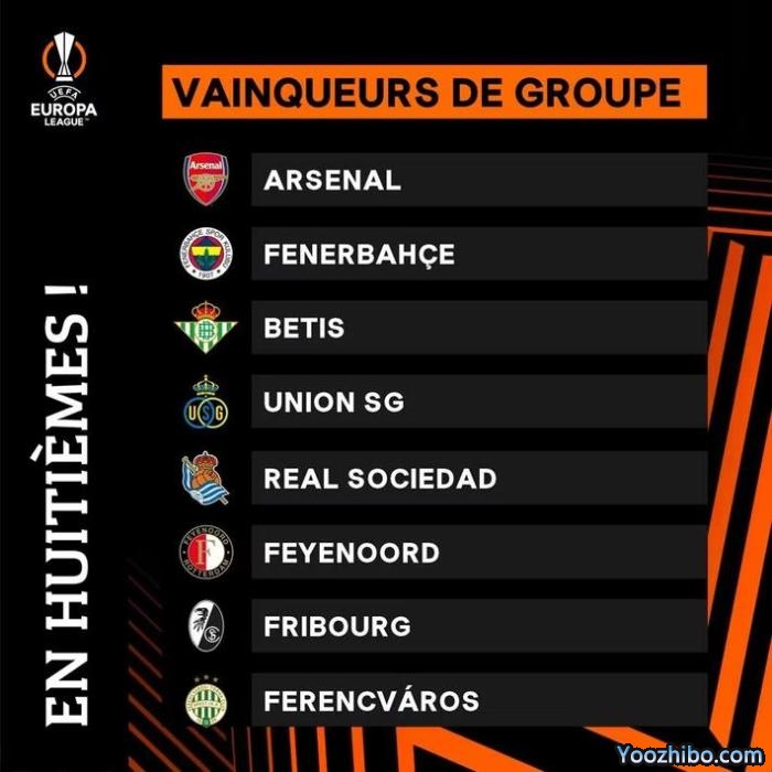 欧联8个直通16强的小组第一:阿森纳、费内巴切、贝蒂斯、圣吉罗斯、皇家社会、费耶诺德、弗赖堡、费伦茨瓦罗斯