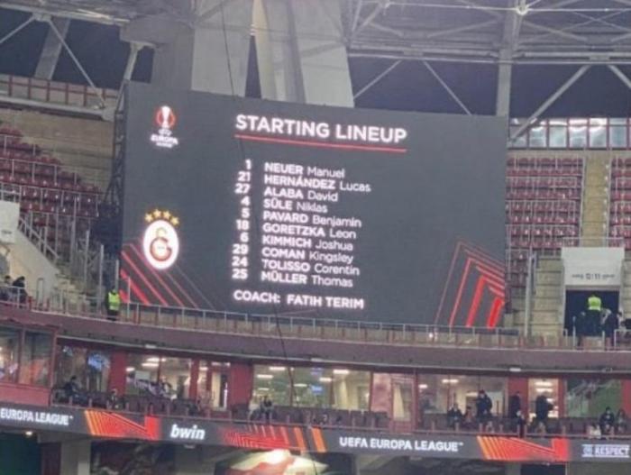 现场大屏幕播放加拉塔萨雷的首发阵容时,出现了诺伊尔、卢卡斯、聚勒、帕瓦尔、格雷茨卡、基米西、托利索、科曼和穆勒等拜仁球员的名字,还有本赛季已经加盟皇马的阿拉巴,主帅还是特里姆,着实吓了莫斯科火车头一跳,他们可能以为对手是拜仁。