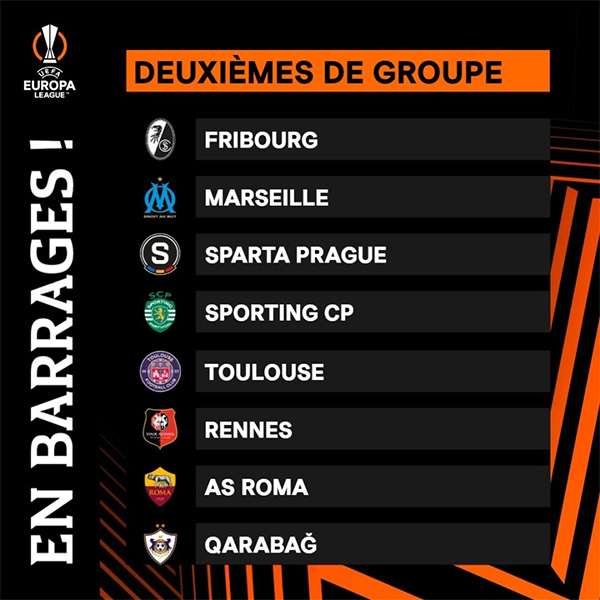 而弗赖堡(德甲)、马赛(法甲)、布拉格斯巴达(捷克甲)、葡萄牙体育(葡超)、图卢兹(法甲)、雷恩(法甲)、罗马(意甲)、卡拉巴赫(阿塞拜疆超)这8个小组第2名,则要参加欧联杯附加赛,他们将成为种子队。