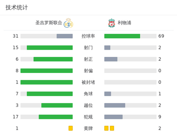 全场比赛结束,最终利物浦1-2圣吉罗斯。
